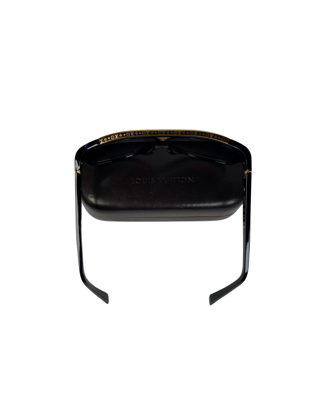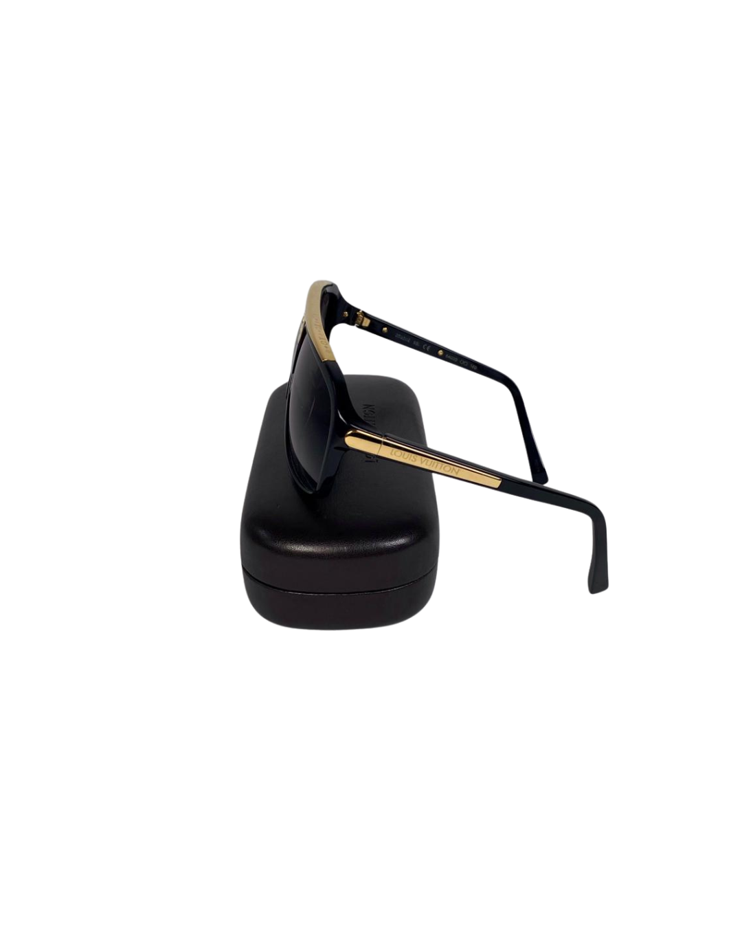 The sleek frame is complemented by striking gold-tone hardware at the front, subtly engraved with the Louis Vuitton signature on the sides — a refined touch that adds depth and distinction. Finished with tinted lenses, these sunglasses offer both style and everyday wearability.
