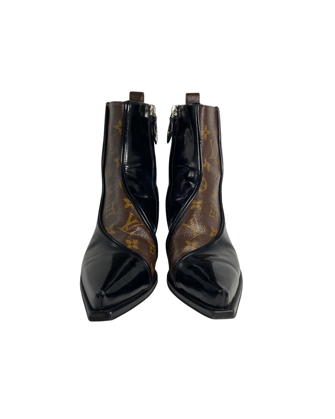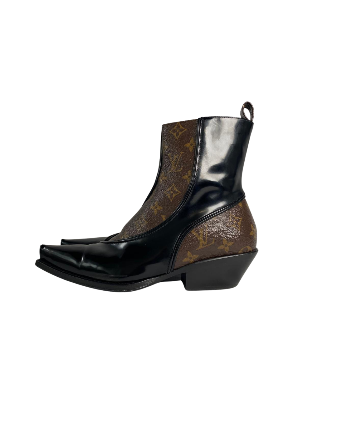 A bold fusion of heritage craftsmanship and statement design, these Louis Vuitton Matador Boots are the definition of elevated edge. Crafted in glossy black patent leather, they feature the iconic embossed Monogram motif — subtle yet unmistakably LV.